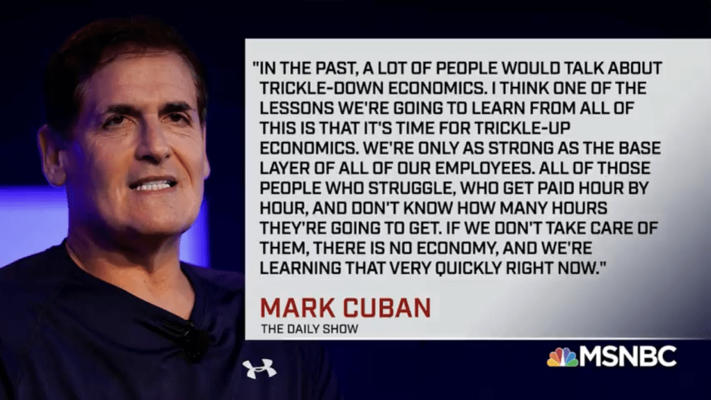 Apparemment, l’économie est plus importante que les vies humaines. Mais qui va faire tourner l’économie, sans les humains? Qui va fabriquer et acheter quoi, s’il n’y a plus personnes pour faire vivre l’économie? Heureusement, des entrepreneurs chevronnés comme Mark Cuban, préviennent: