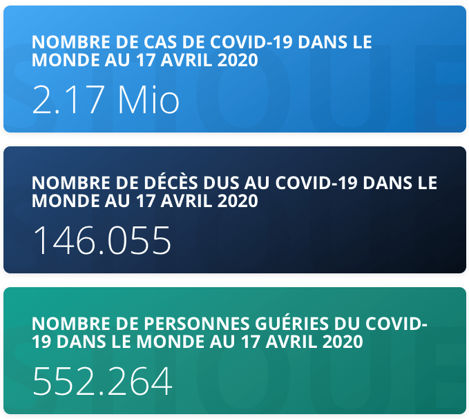 Au 17 avril 2020, il ya 25,4% de personnes guéries du covid-19, et 6,7% de décès par covid-19, soit 552 264 guérisons et 146 055 morts, sur 2 170 000 infectés à l’échelle mondiale! Les États-Unis à eux seuls, décomptent plus de 40 000 morts! La ville de New York a plus de 9 000 morts! L’Etat de New York, plus de 14 000 décès! Quelle tragédie!
